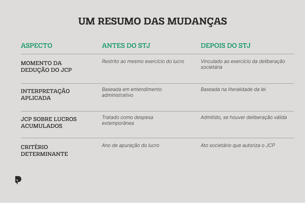 A decisão do STJ esclarece o ‘quando’, mas não altera o ‘como’. A dedução do JCP continua condicionada ao atendimento de critérios técnicos que permanecem íntegros.