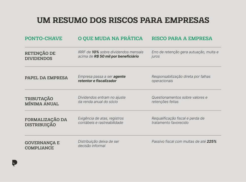 Com a tributação de dividendos para pessoas físicas e a retenção de 10% de IRRF sobre valores mensais superiores a R$ 50 mil pagos por uma mesma empresa à mesma pessoa física, rompe-se com o regime de isenção vigente desde 1996. Esse movimento desloca para a empresa obrigações operacionais e fiscais que antes não faziam parte da sua rotina.